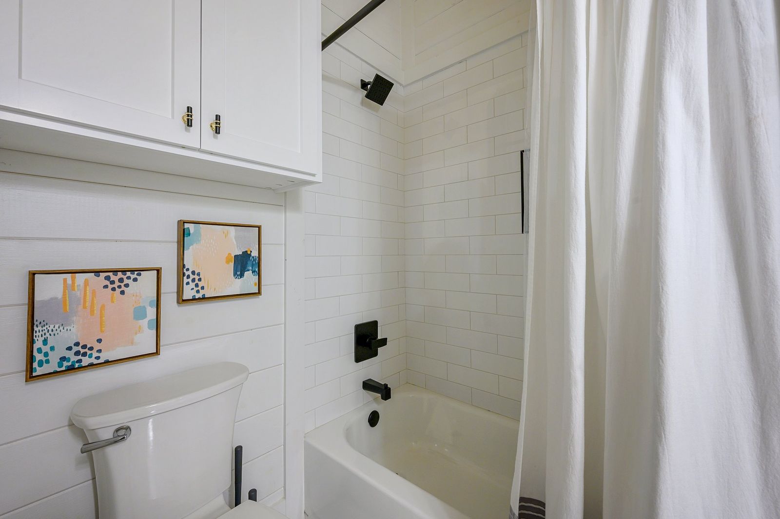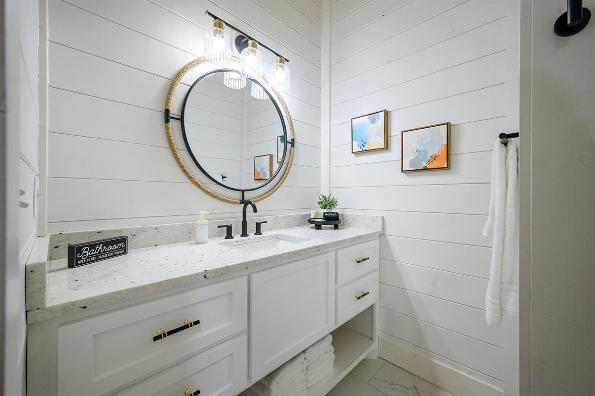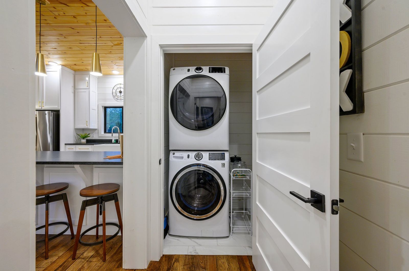 The fully equipped kitchen includes modern appliances—oven, microwave, electric stovetop, and an oversized farmhouse sink—plus all cookware and utensils needed to create memorable meals. A washer and dryer are conveniently located just off the kitchen.
