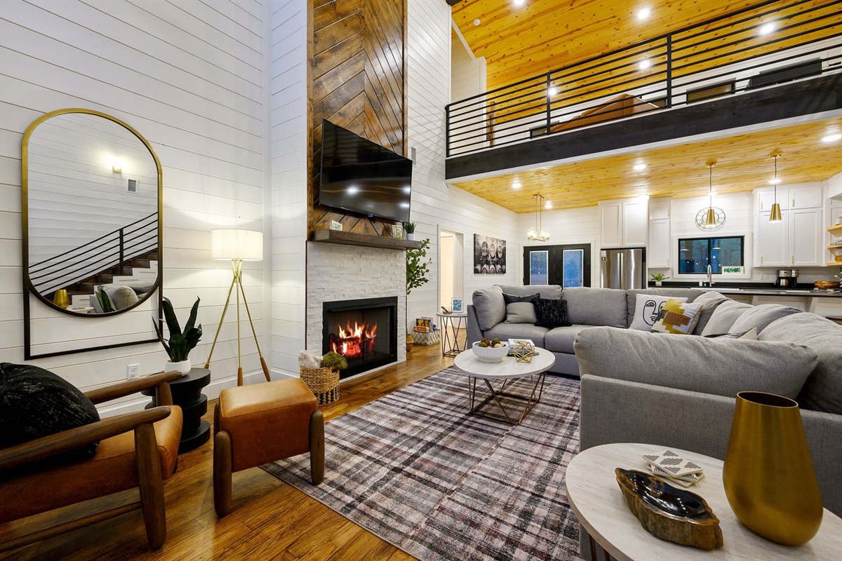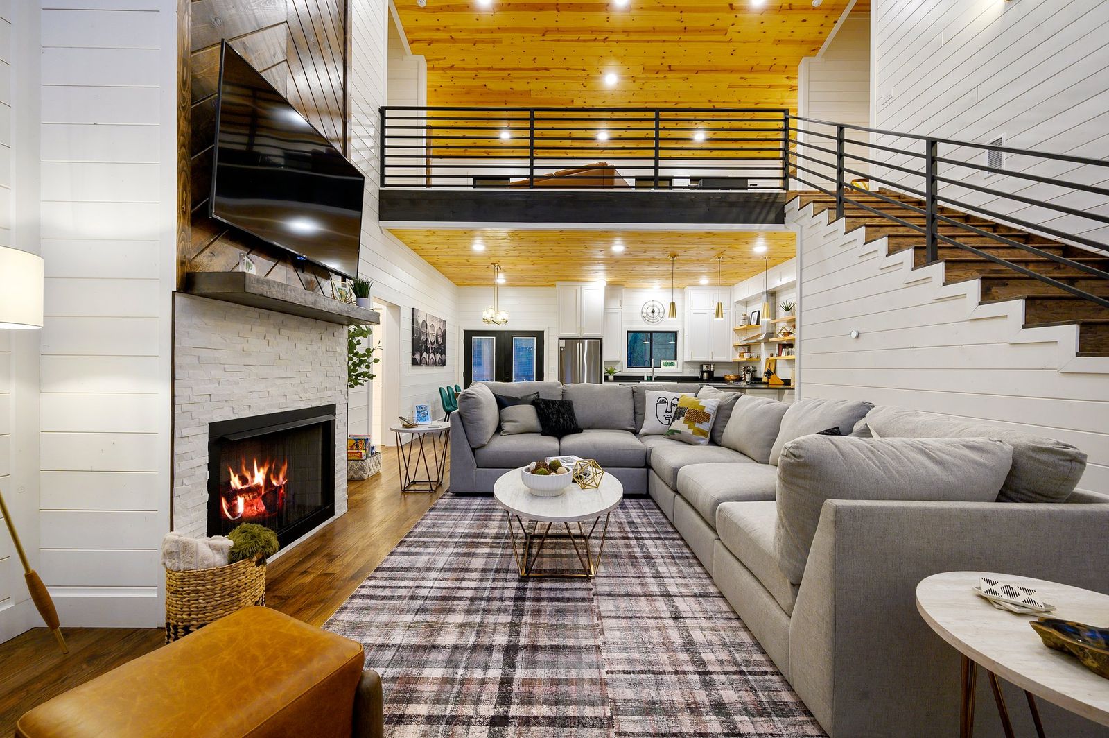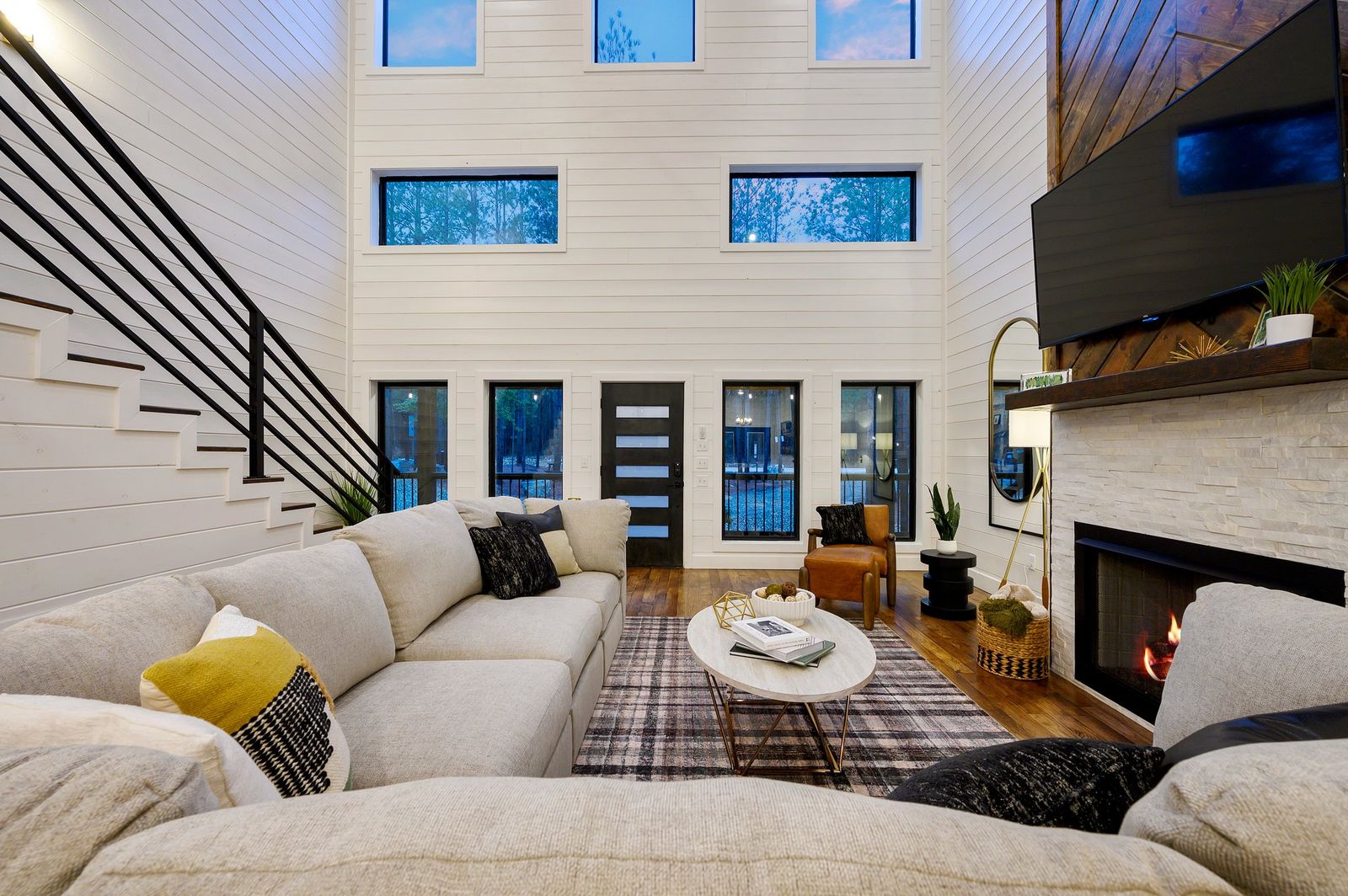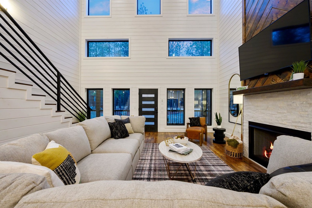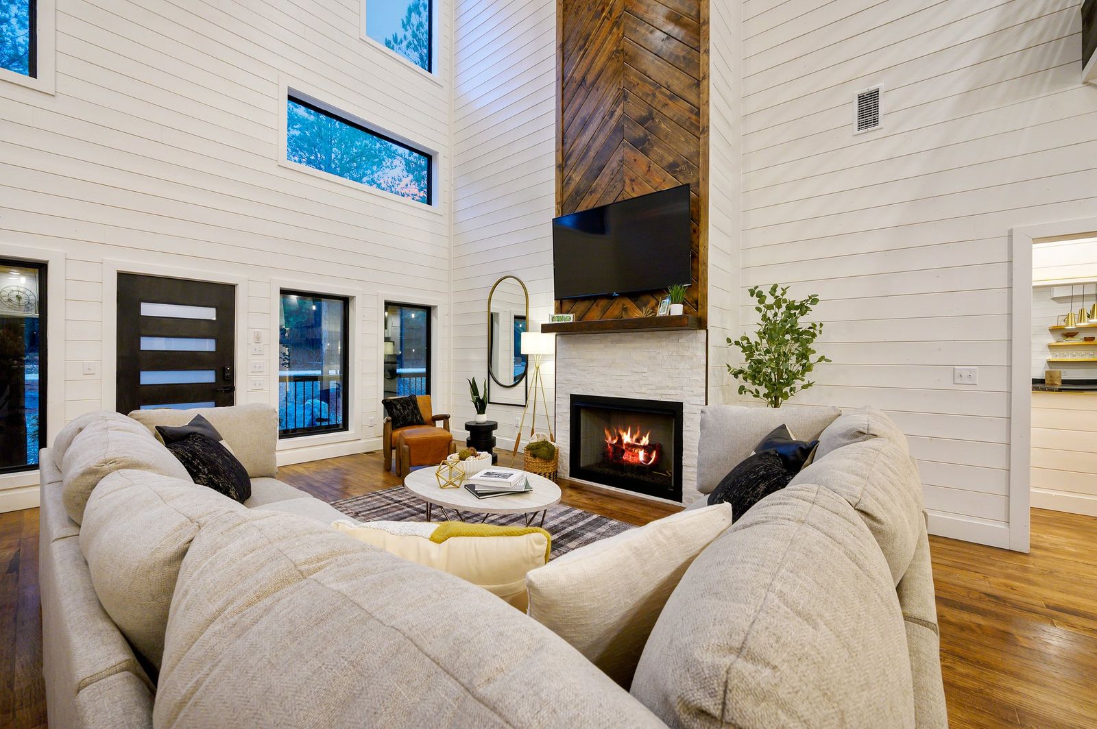The heart of the home is the main lodge room, centered around a stunning floor-to-ceiling fireplace. This warm and welcoming space features a new oversized luxury sofa, two lounging chairs, and a Smart TV, creating the perfect spot for conversation, movie nights, or cozy evenings by the fire.