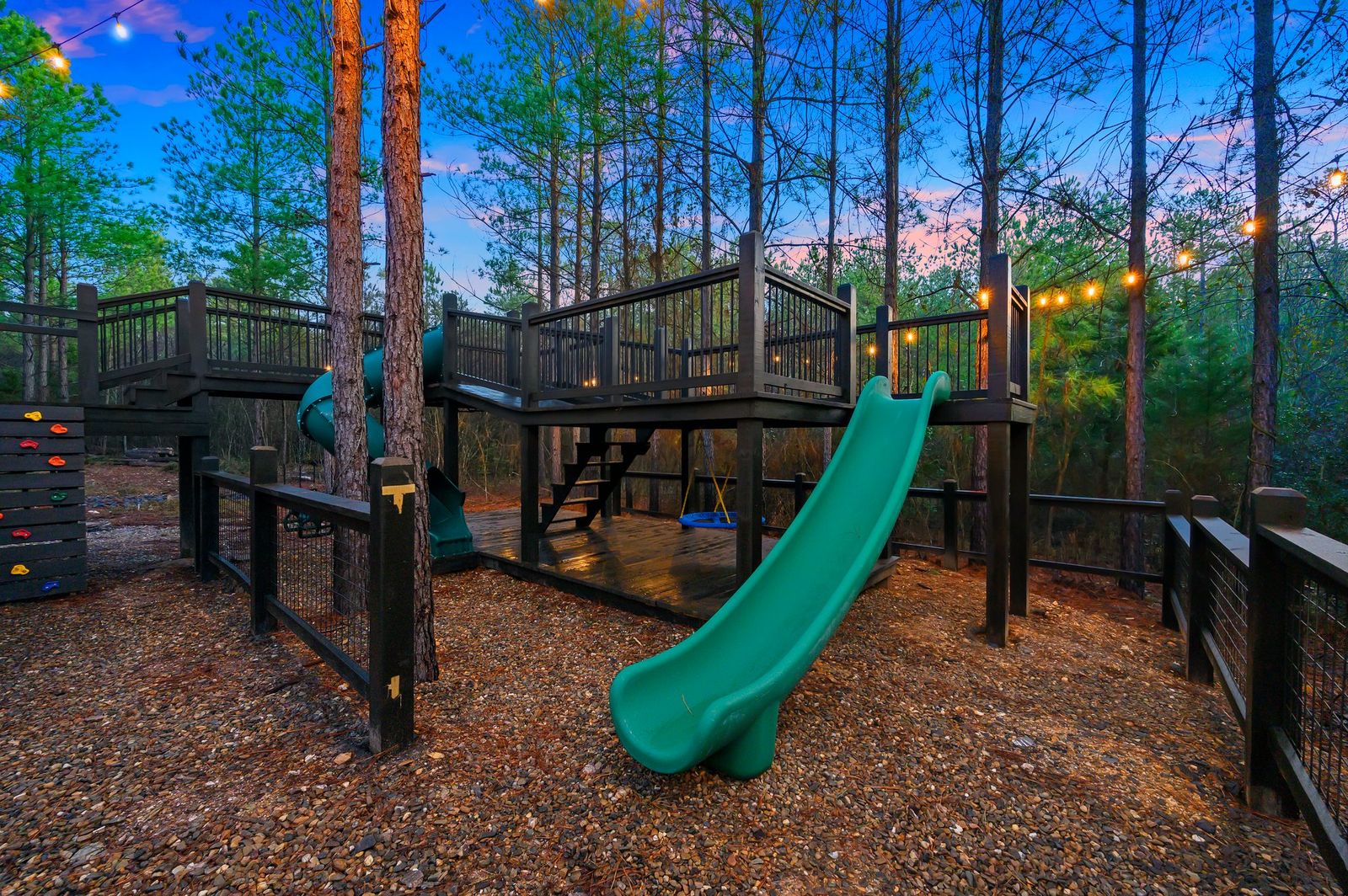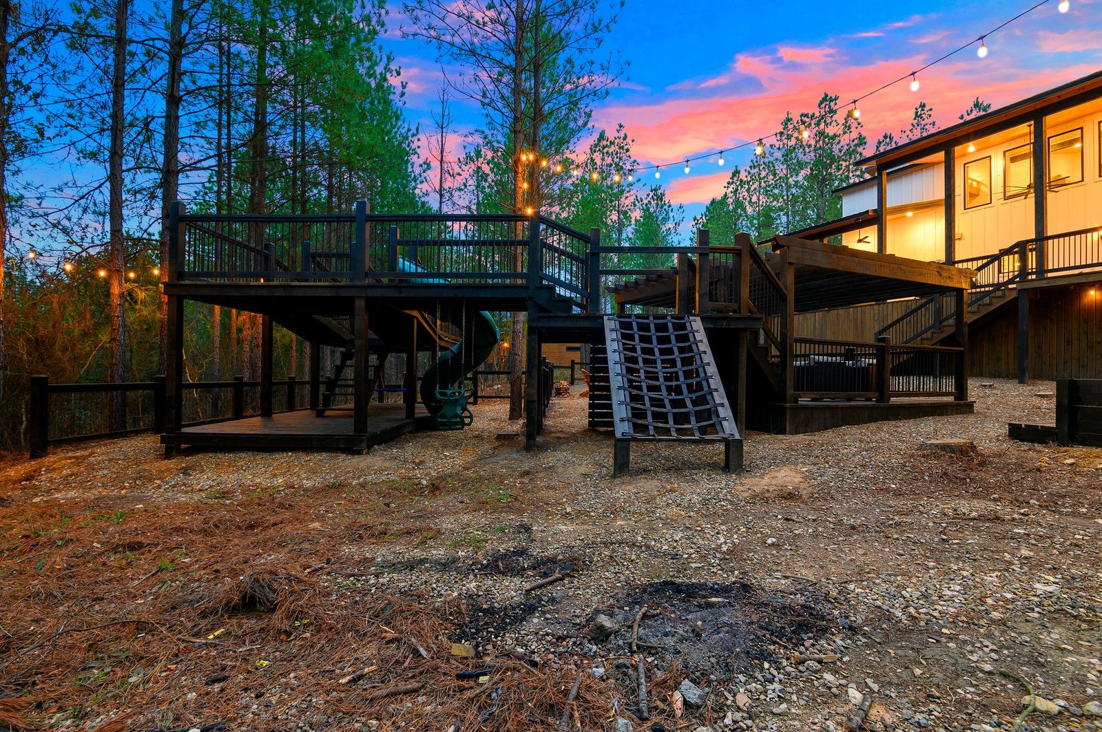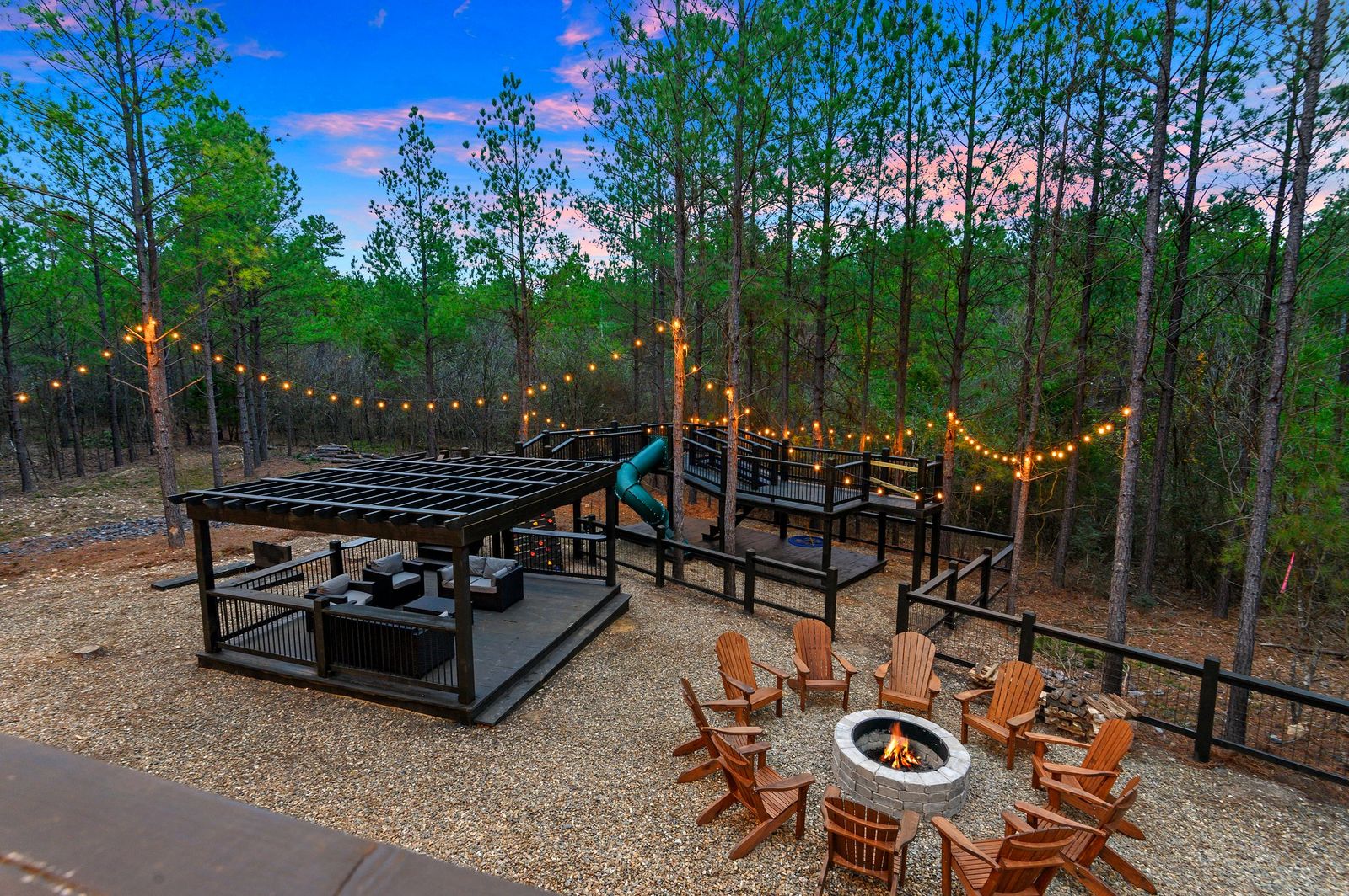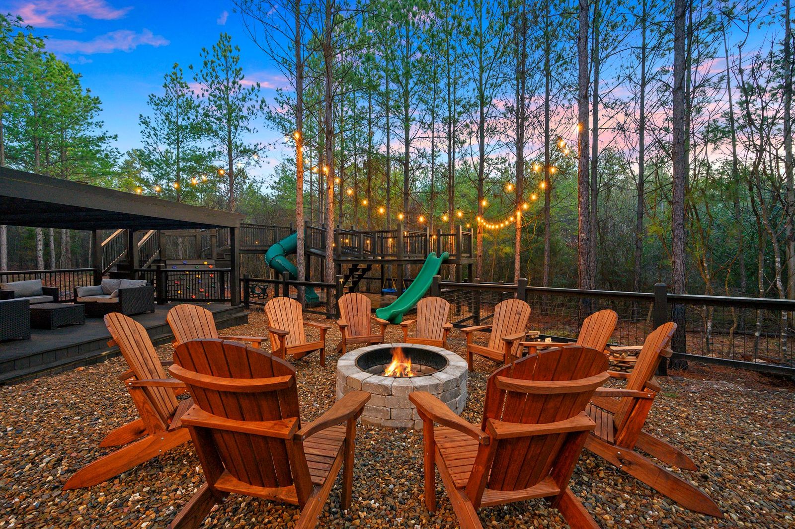 On the lower level, you’ll find a custom playscape for kids, a fire pit with Adirondack chairs, and more outdoor seating for gathering and storytelling.