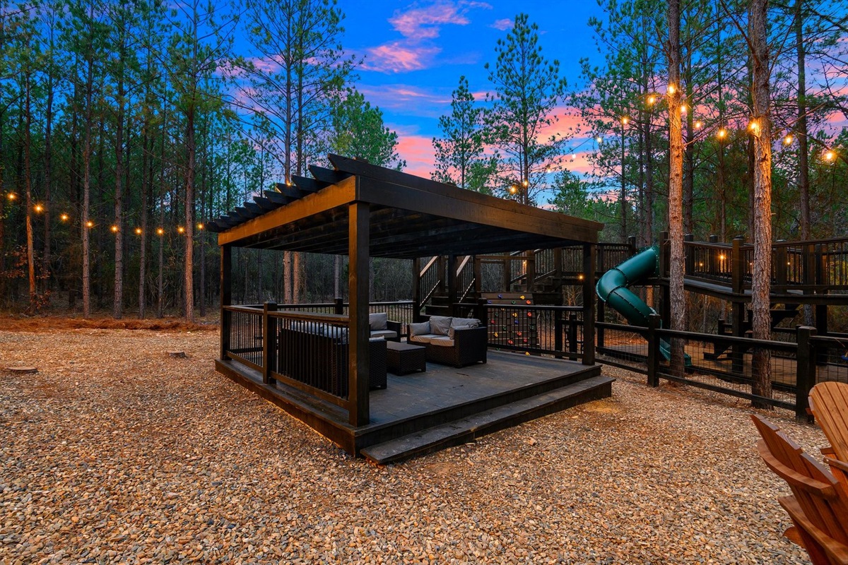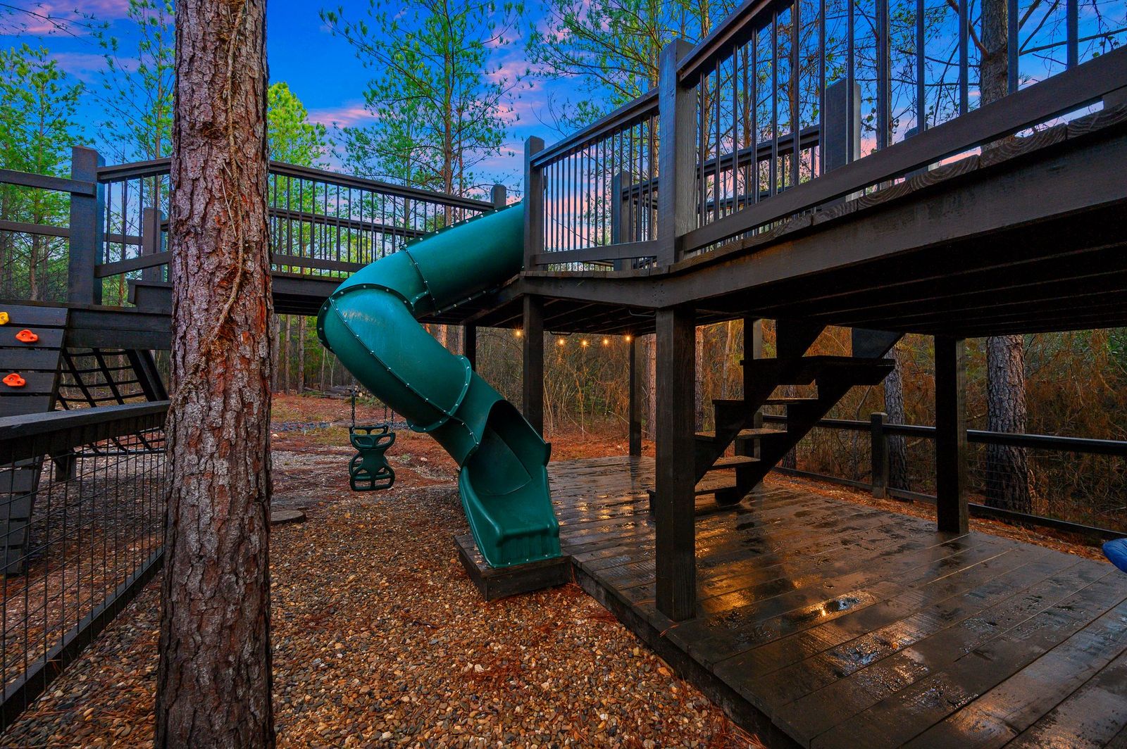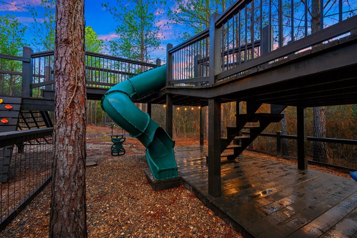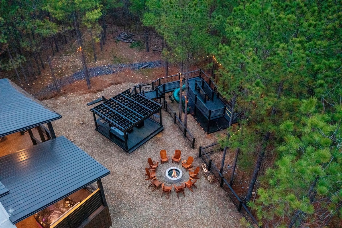 On the lower level, you’ll find a custom playscape for kids, a fire pit with Adirondack chairs, and more outdoor seating for gathering and storytelling.