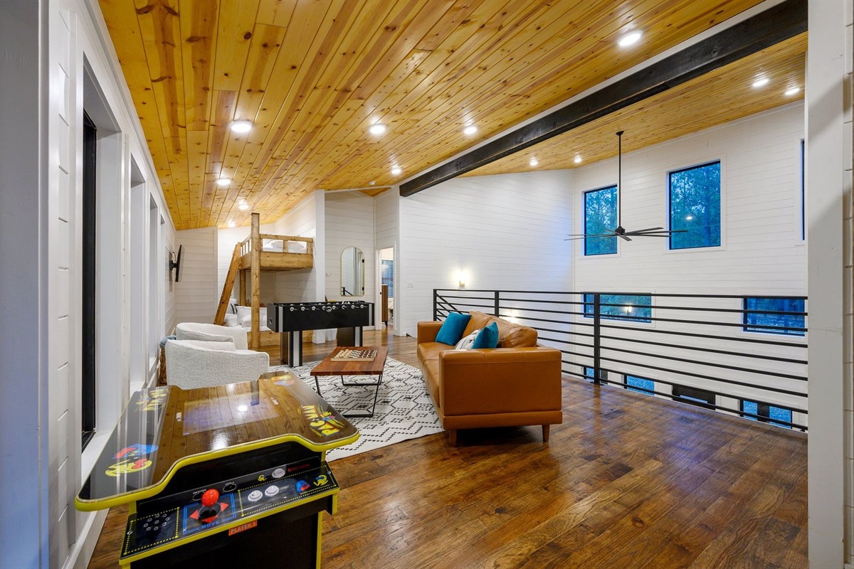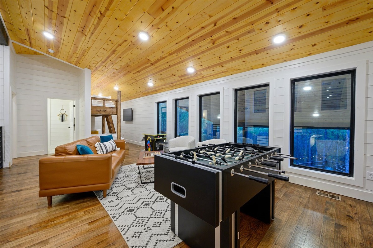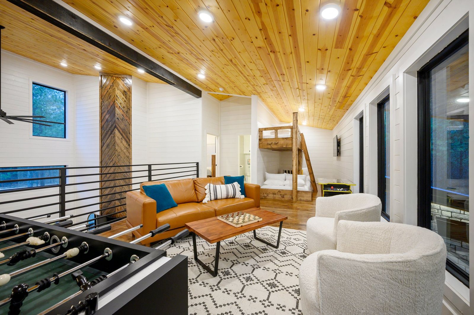 Upstairs, the game room and loft double as a fun entertainment space and bunk area, featuring a foosball table, arcade console, lounging chairs, and a comfortable couch—perfect for games, laughter, and relaxation.