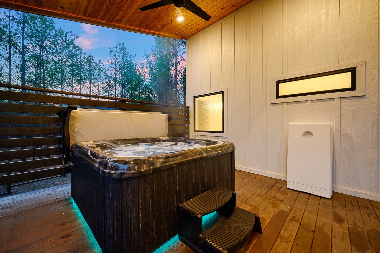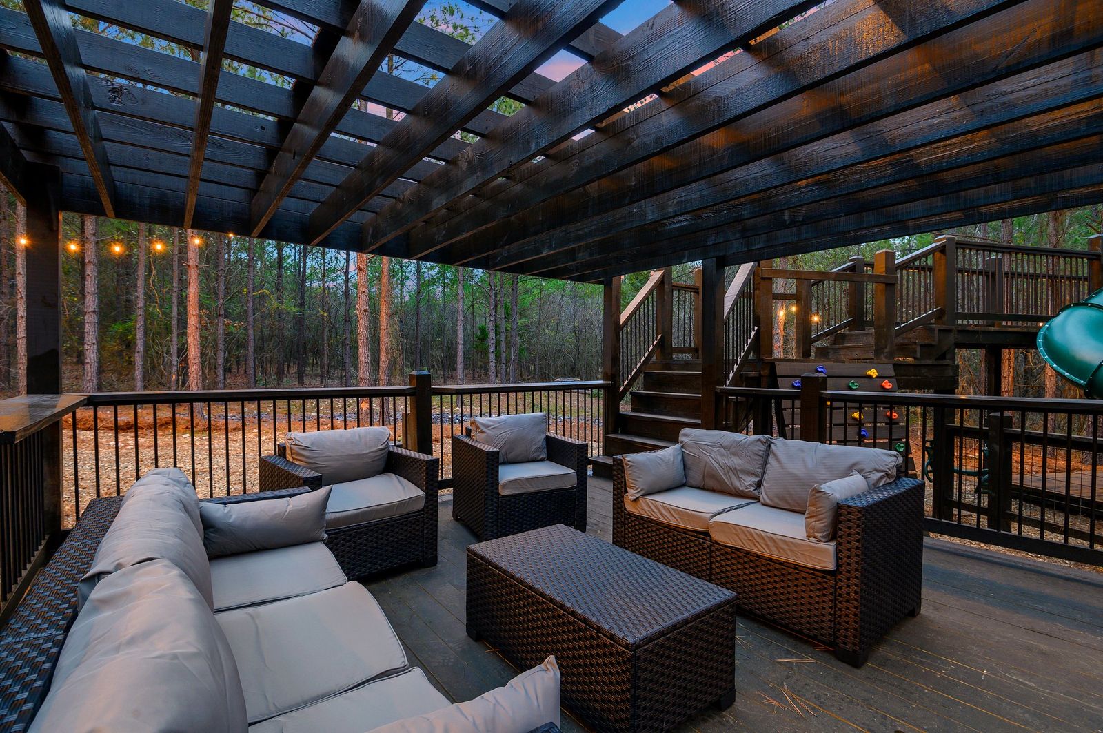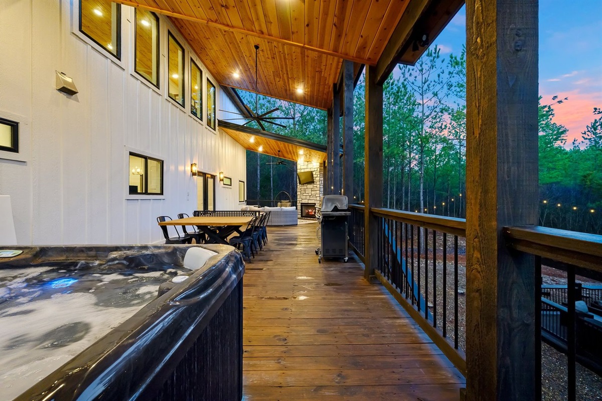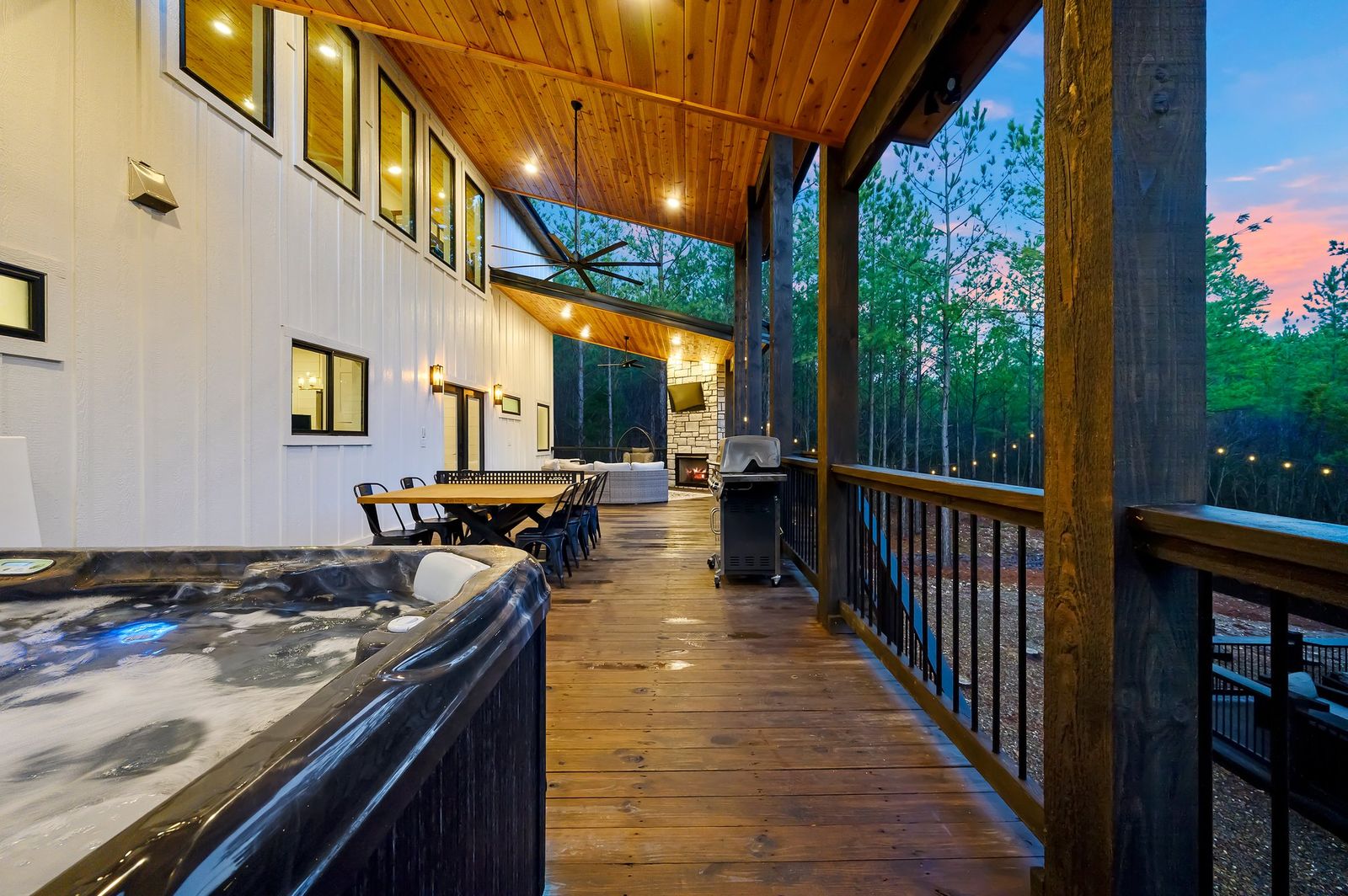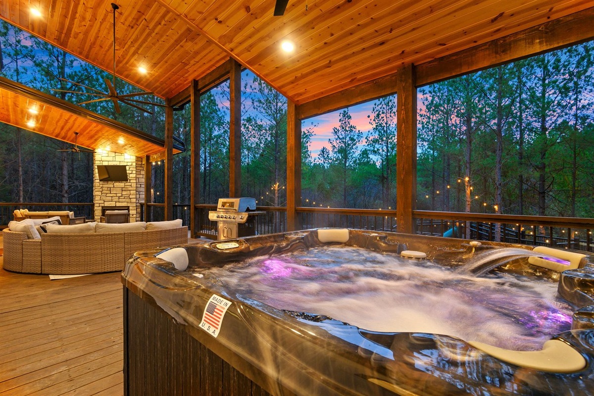 Step onto the covered patio, where you’ll find an 8-person oversized hot tub, the perfect place to unwind. The outdoor dining table seats 10 and cleverly converts into a ping pong table for extra fun. A gas grill (propane included) makes outdoor cooking a breeze.