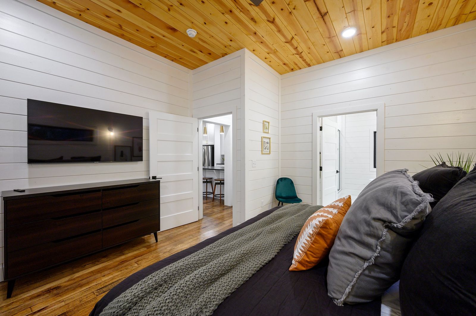 King Suite 4: King bed, TV, dresser, and private bath with walk-in shower.
