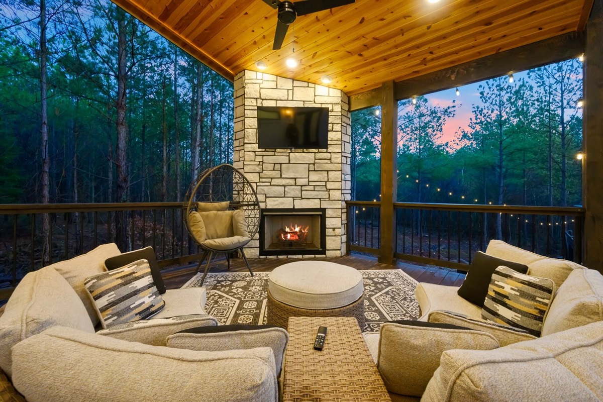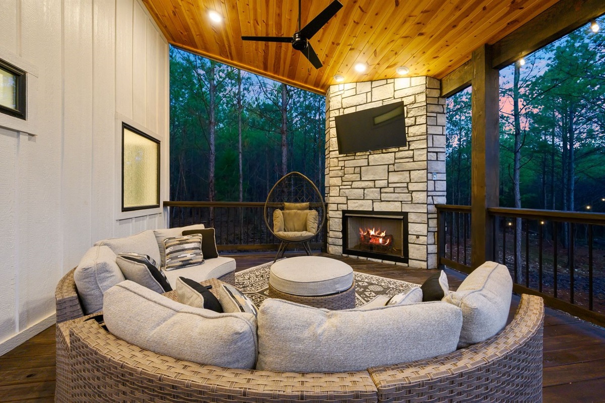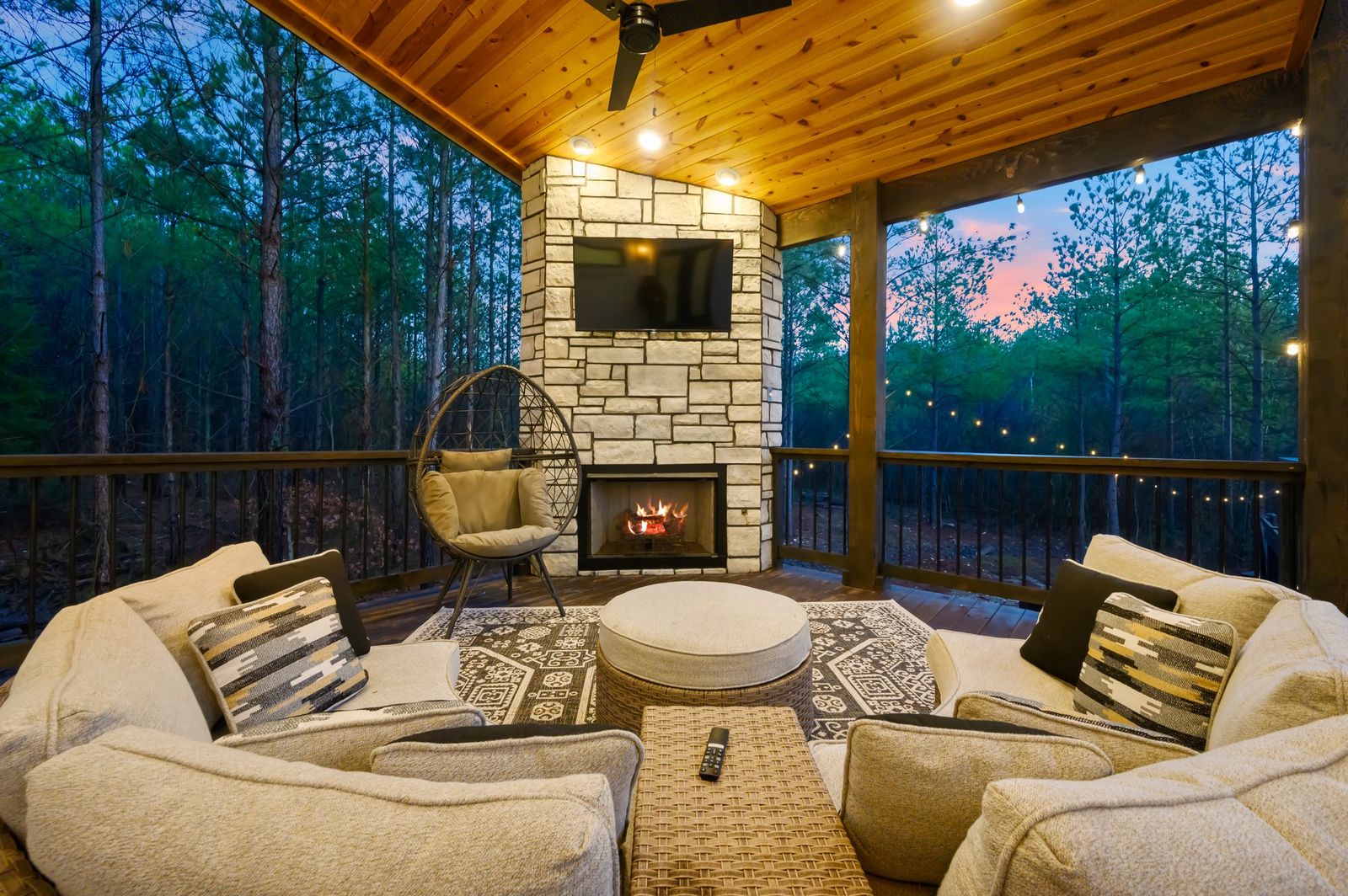Relax around the outdoor gas fireplace, surrounded by a large sectional couch, lounge chairs, and a Smart TV—a cozy spot for evenings under the stars.
