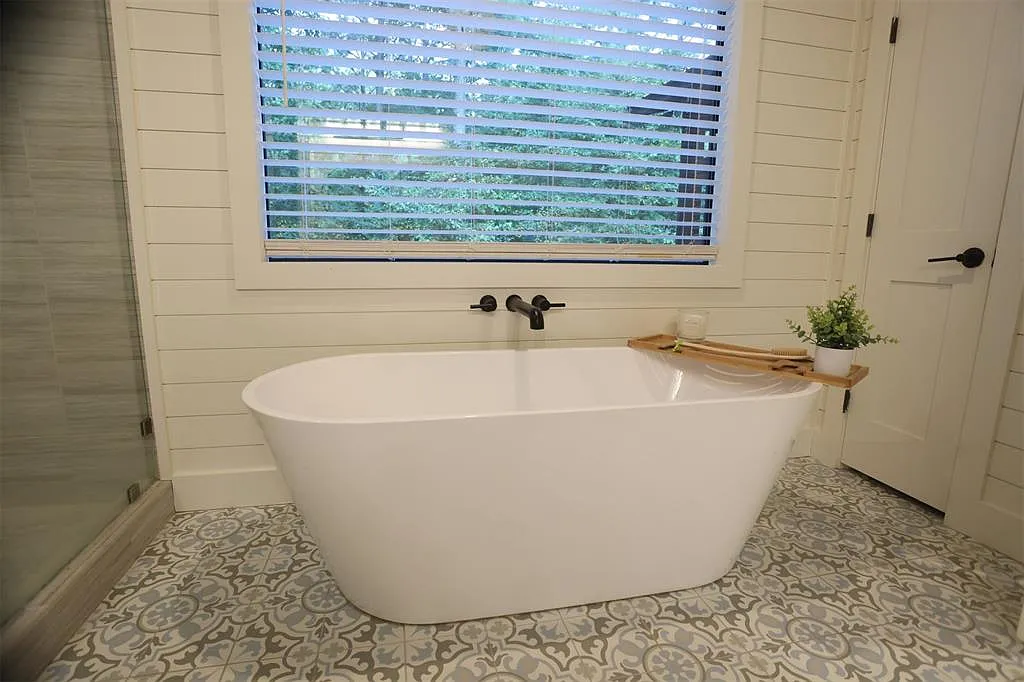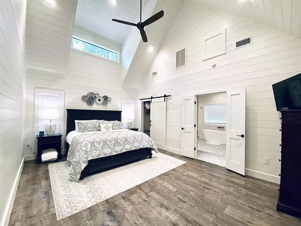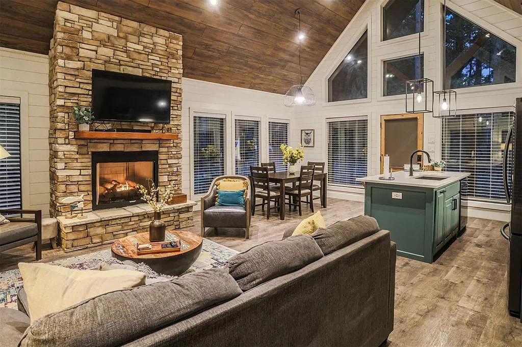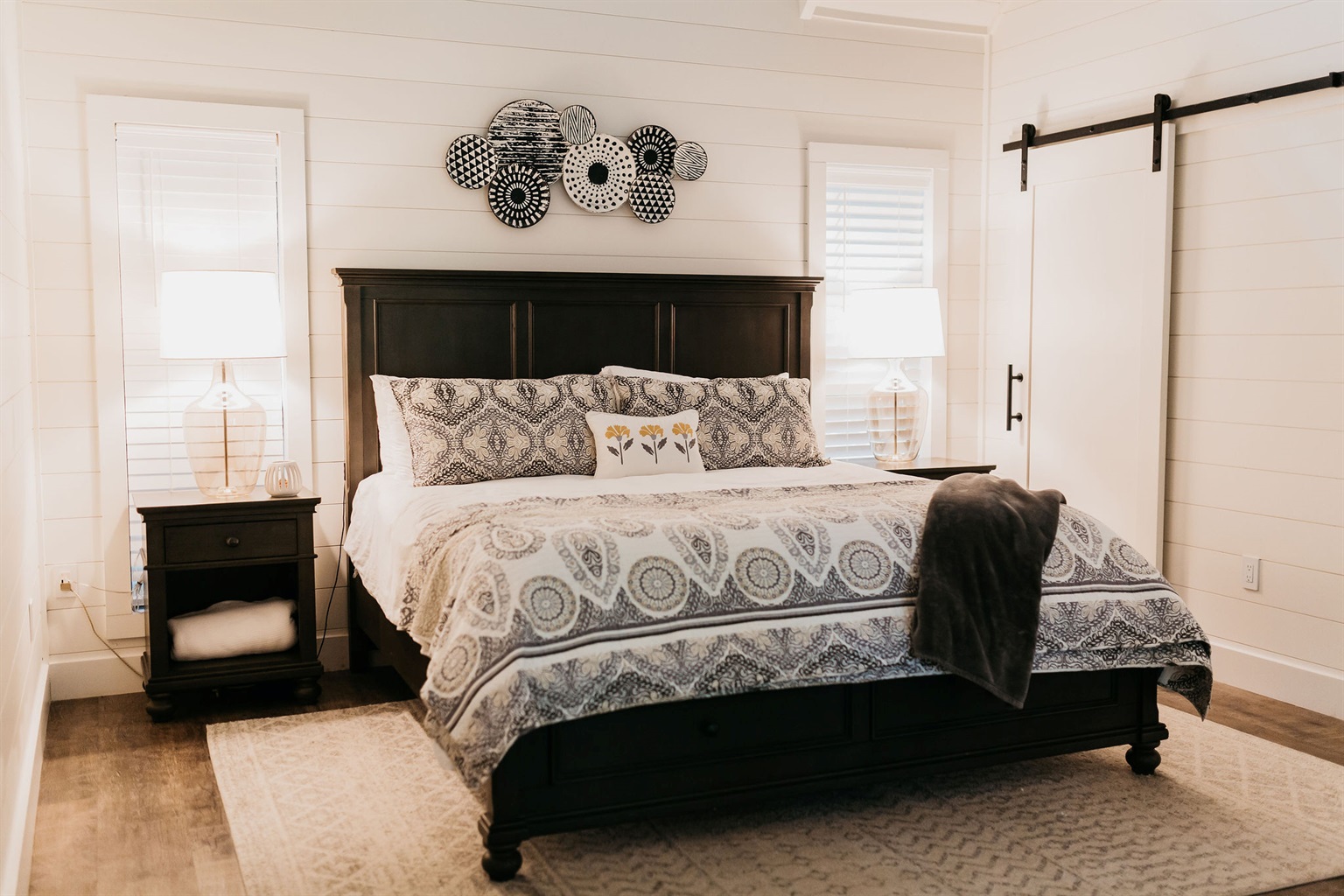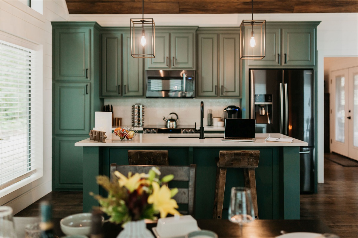 The living area is bright with lots of windows, white shiplap walls, and warm wood floors. There’s a queen pullout sofa for kids. The kitchen has custom green cabinets, quartz counters, black stainless appliances, and everything you need. You’ll also have a Keurig, drip maker, french press, and cold brew maker. The dining table is perfect for meals or board games.