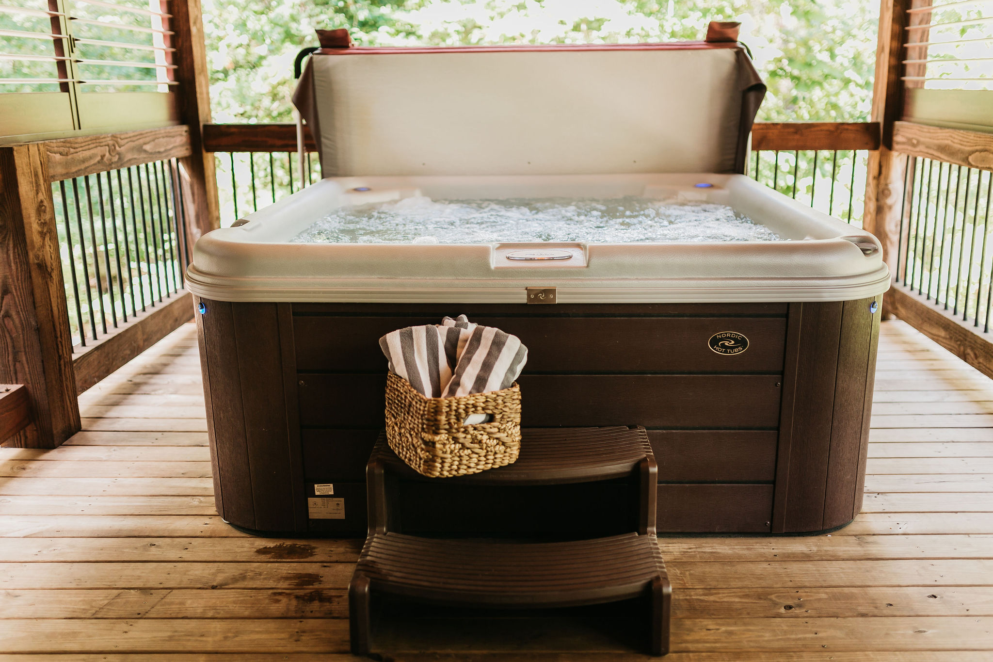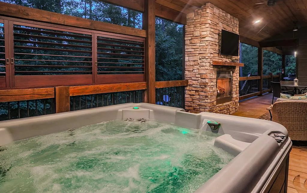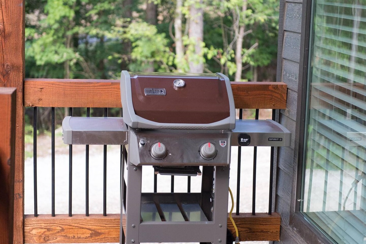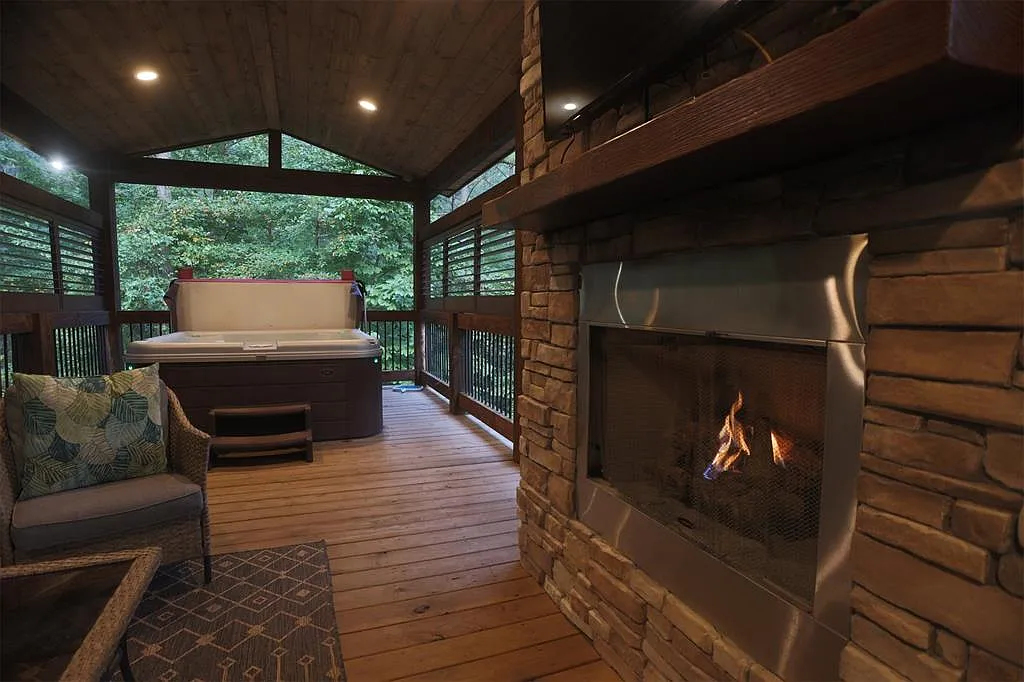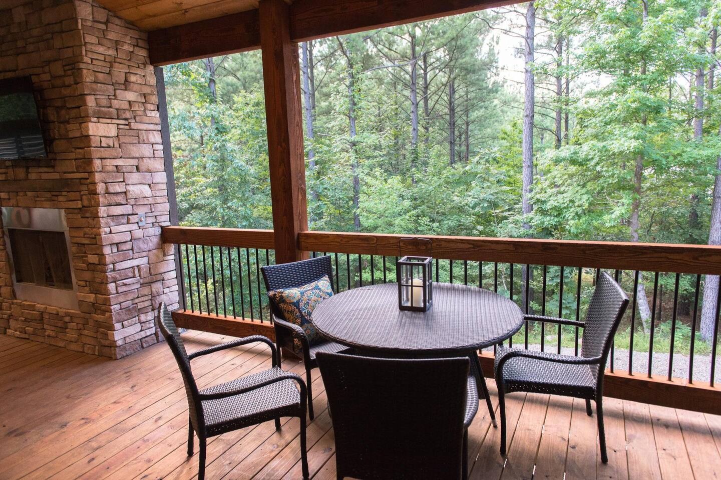 The back deck looks into the woods and includes a sitting area with a fireplace and TV, a dining table, a private hot tub, and a Weber grill connected to the propane tank.
