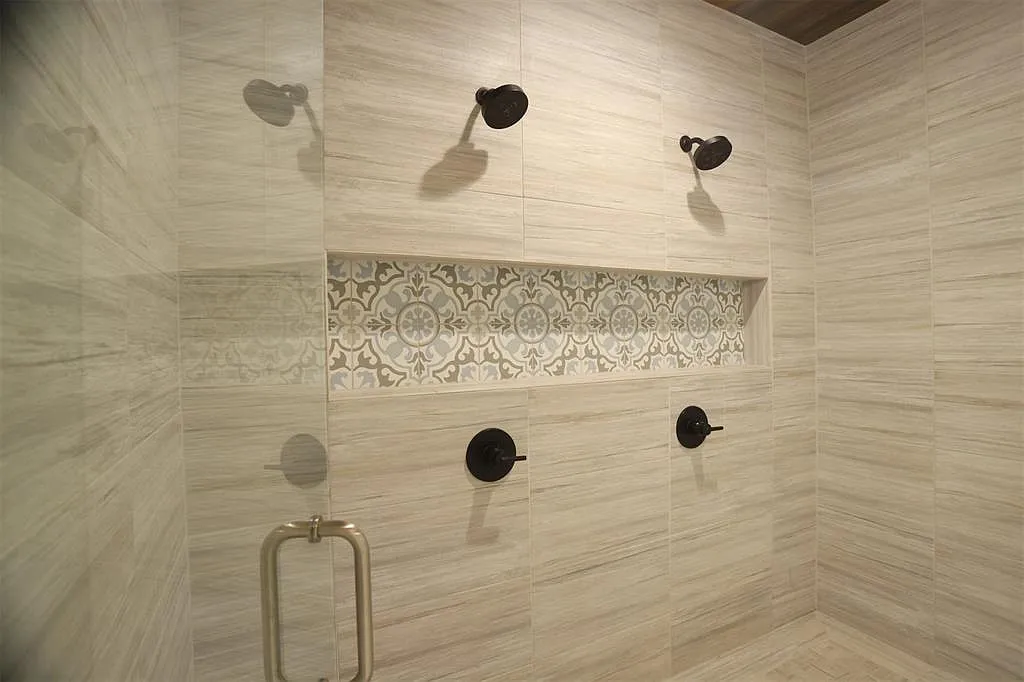 The bathroom has a deep soaking tub, a large two head shower, a custom vanity, and beautiful tile. There’s a full size washer and dryer, plus an iron and steamer.