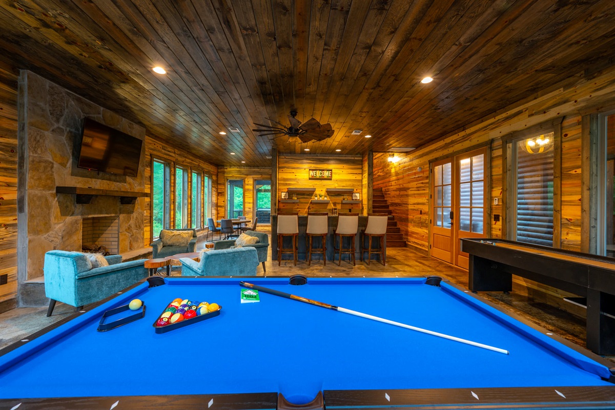 Expansive Game Room – also on the main level, featuring a pool table, arcade games, shuffleboard, and card table