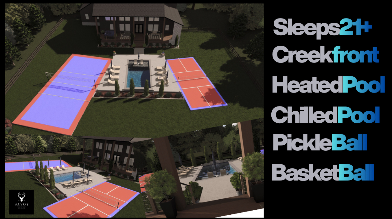 Opening in 2026, The Grand Savoy blends luxury living with the beauty of nature. Set along a flowing creek, this unique retreat offers a heated pool, pickleball, basketball, and volleyball courts, plus expansive outdoor spaces for relaxation and gatherings. This 5 bedroom property is perfect for families and groups, it delivers comfort, adventure, and upscale amenities in harmony with the great outdoors. Rates & Availability