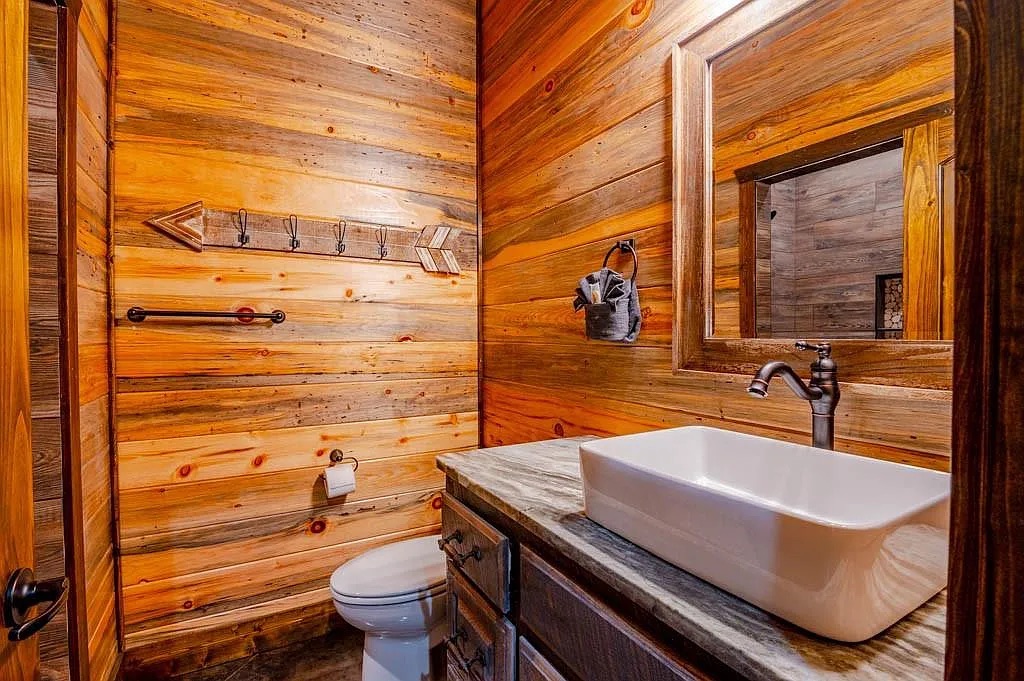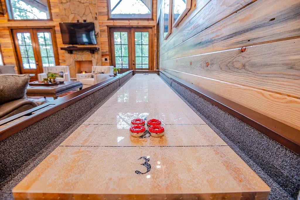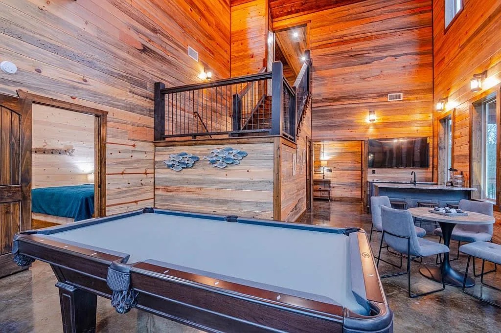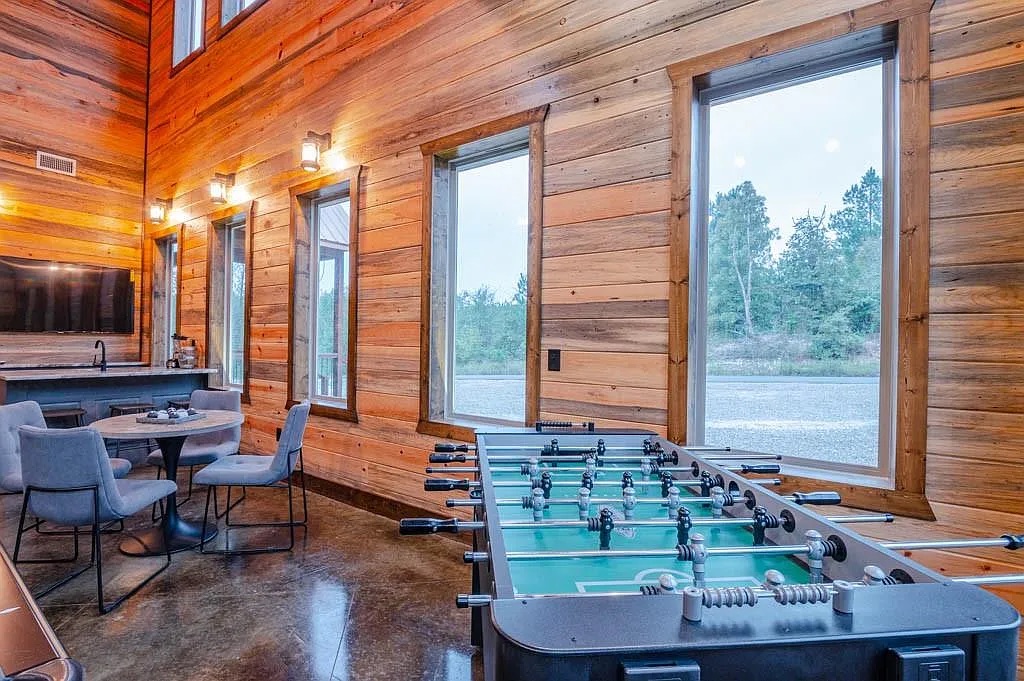 Fun continues in the game room, where a wet bar with an ice maker keeps drinks chilled while guests enjoy a pool table, poker table, foosball, and more. A nearby half bath adds convenience.