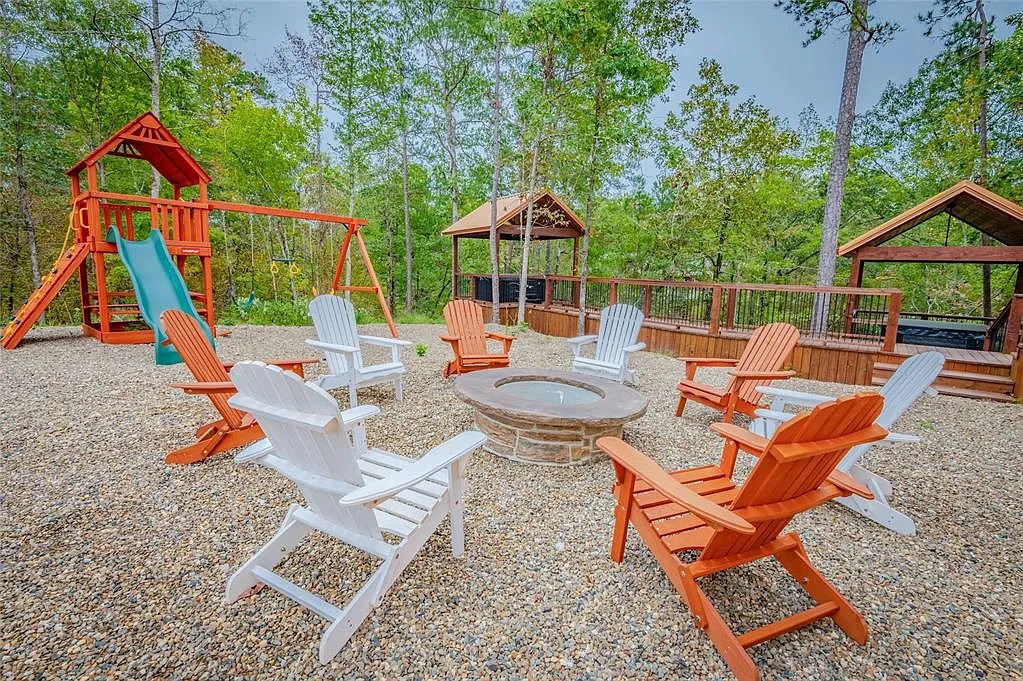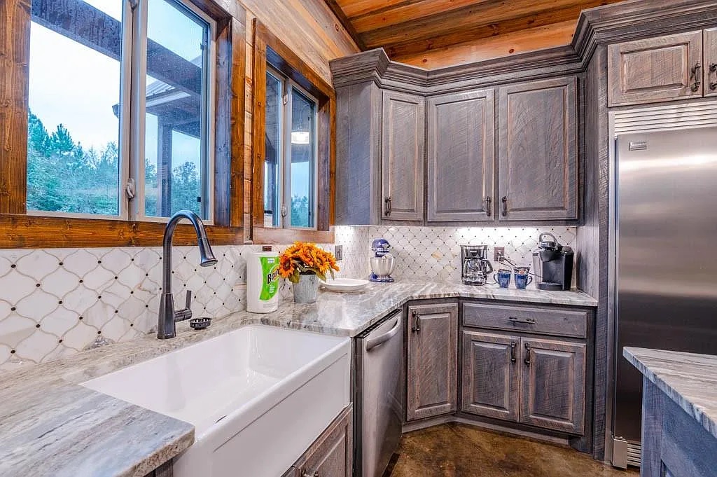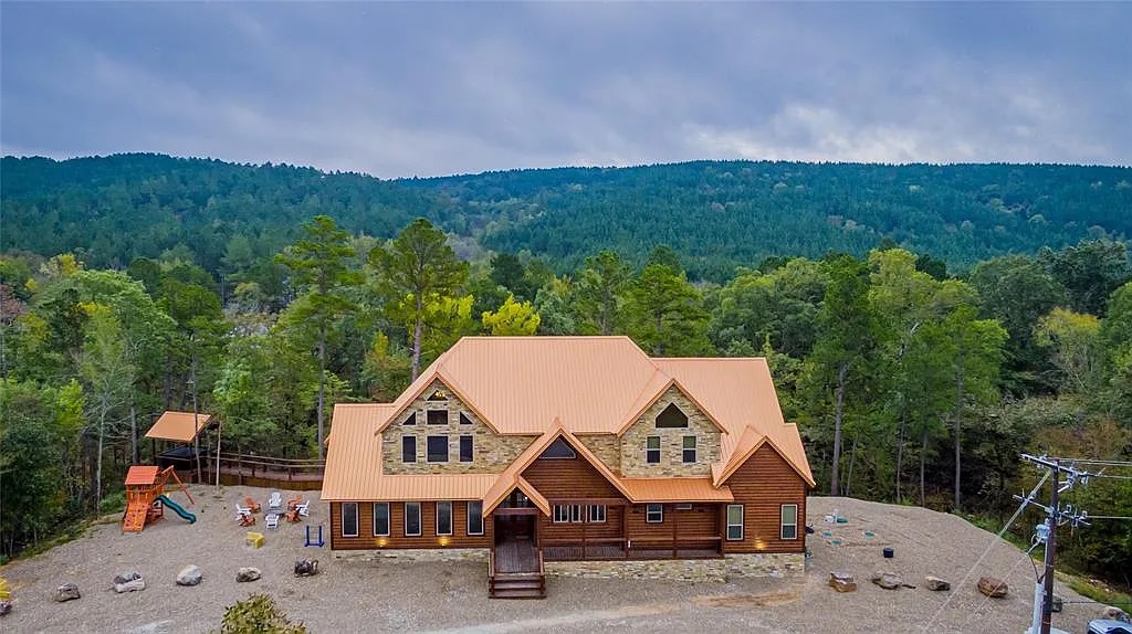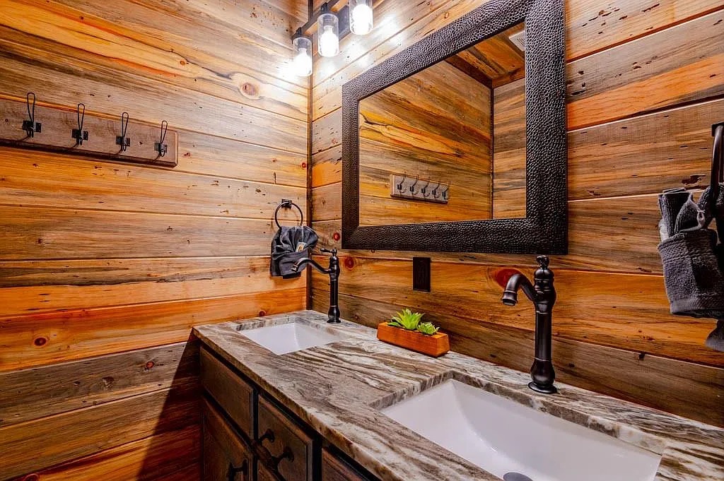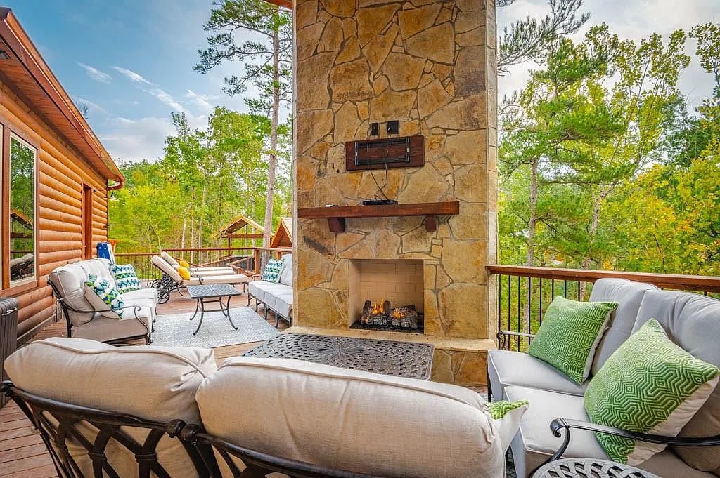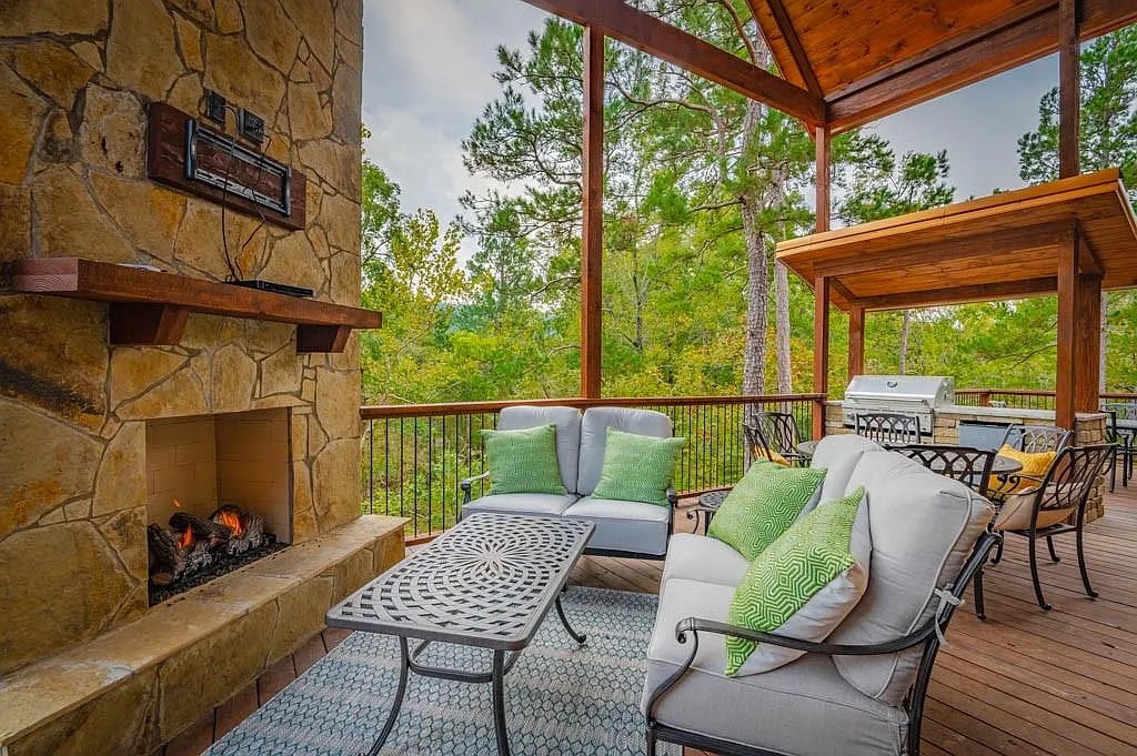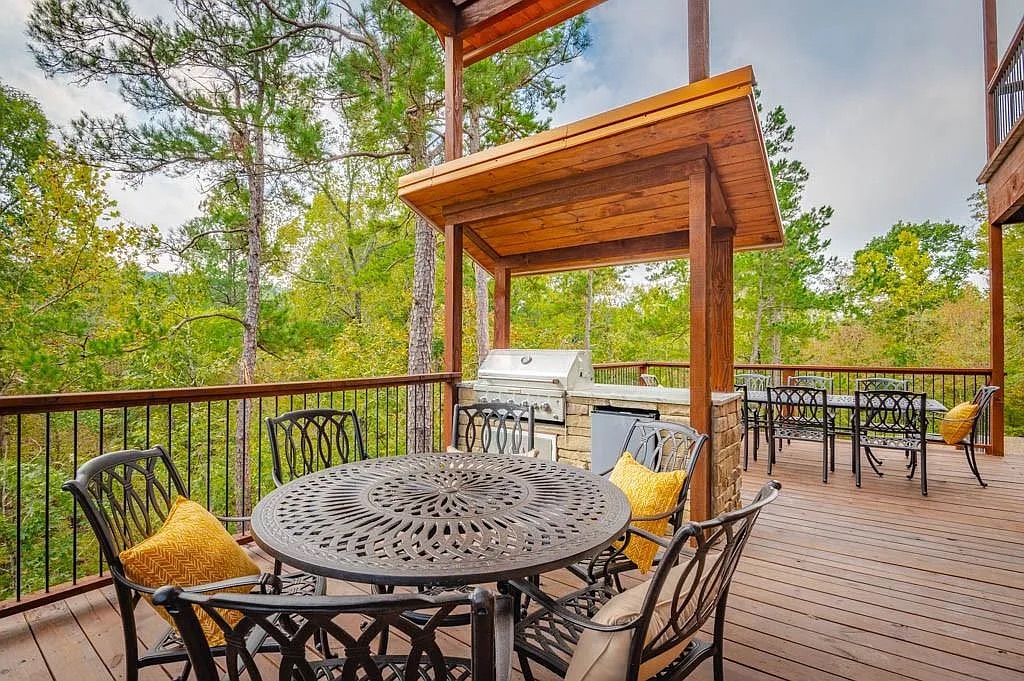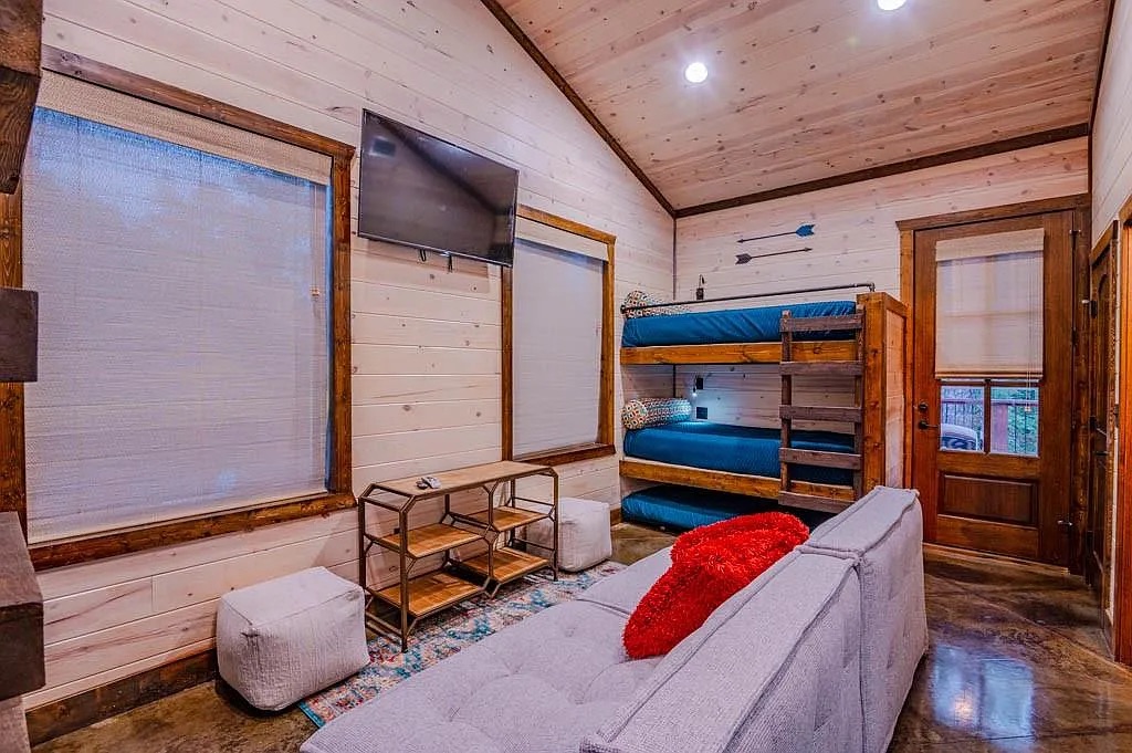 Outside, Velvet Drake shines as an entertainer’s paradise. The back patio features three dining tables for six to eight guests each, plus a cushioned lounge area around the outdoor fireplace and TV. A built-in grill and mini fridge make outdoor meals simple, while two hot tubs provide a peaceful soak. Kids will love the playset, and everyone can gather around the fire pit at night for s’mores under the stars.