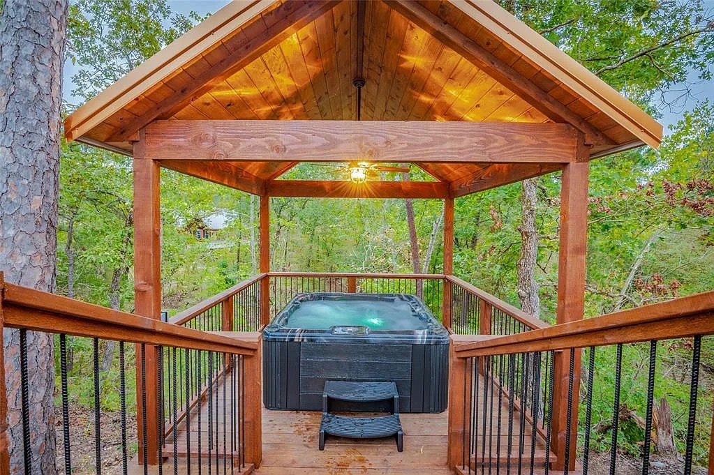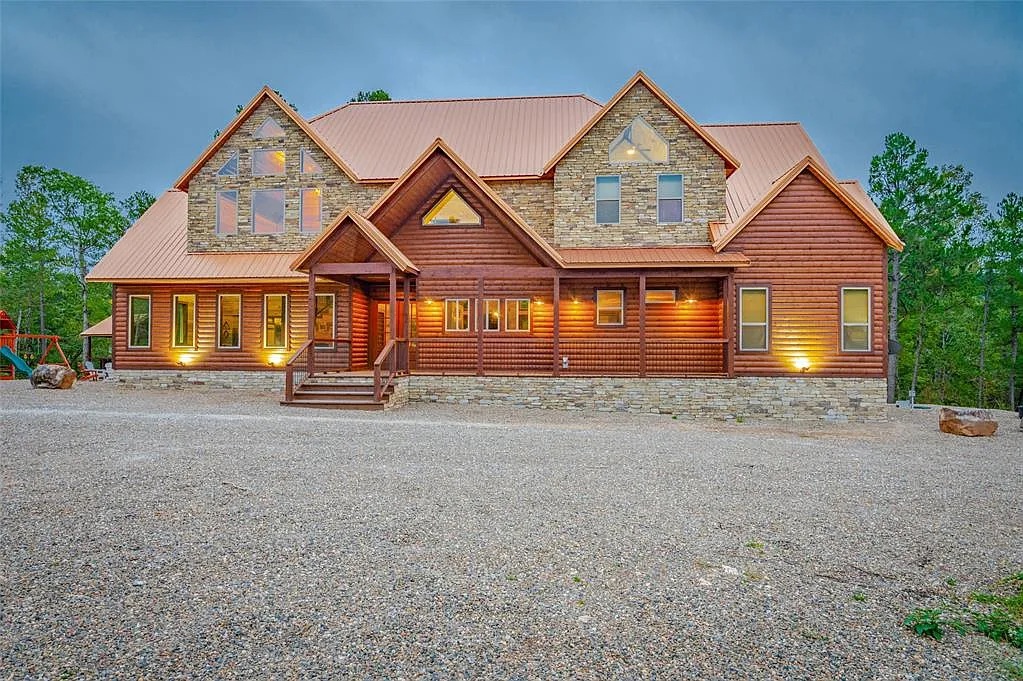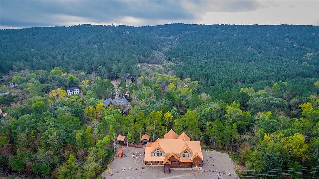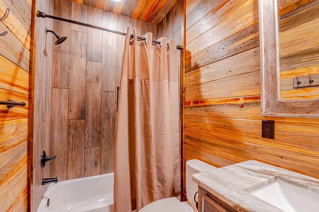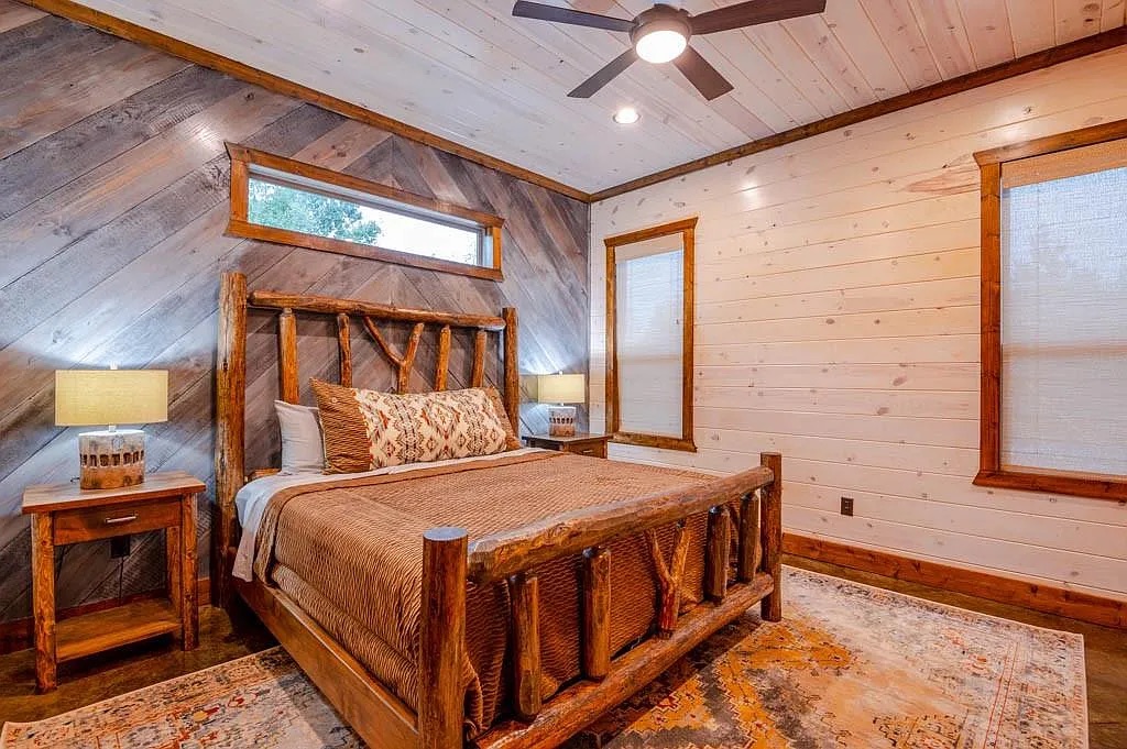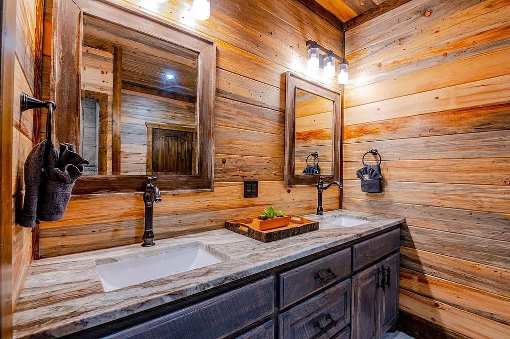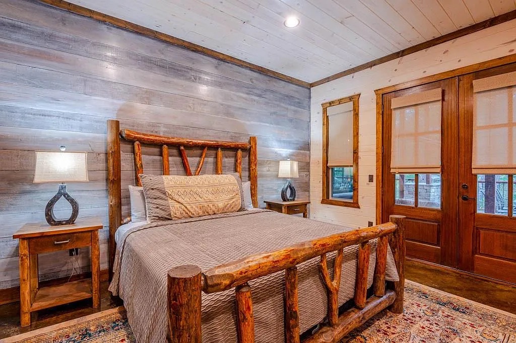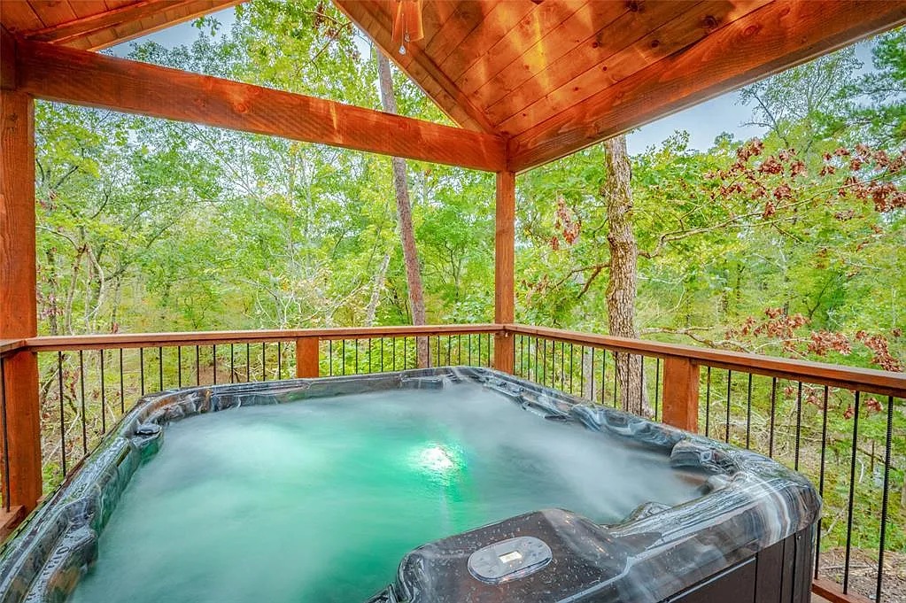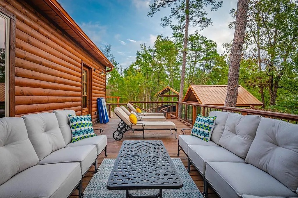 Outside, Velvet Drake shines as an entertainer’s paradise. The back patio features three dining tables for six to eight guests each, plus a cushioned lounge area around the outdoor fireplace and TV. A built-in grill and mini fridge make outdoor meals simple, while two hot tubs provide a peaceful soak. Kids will love the playset, and everyone can gather around the fire pit at night for s’mores under the stars.