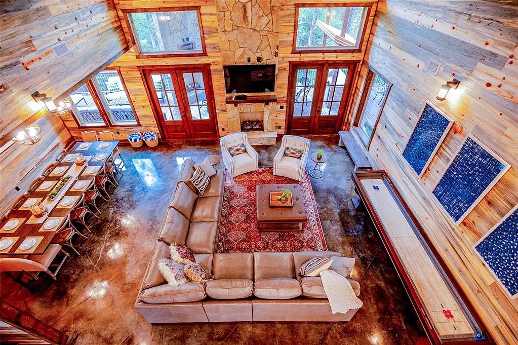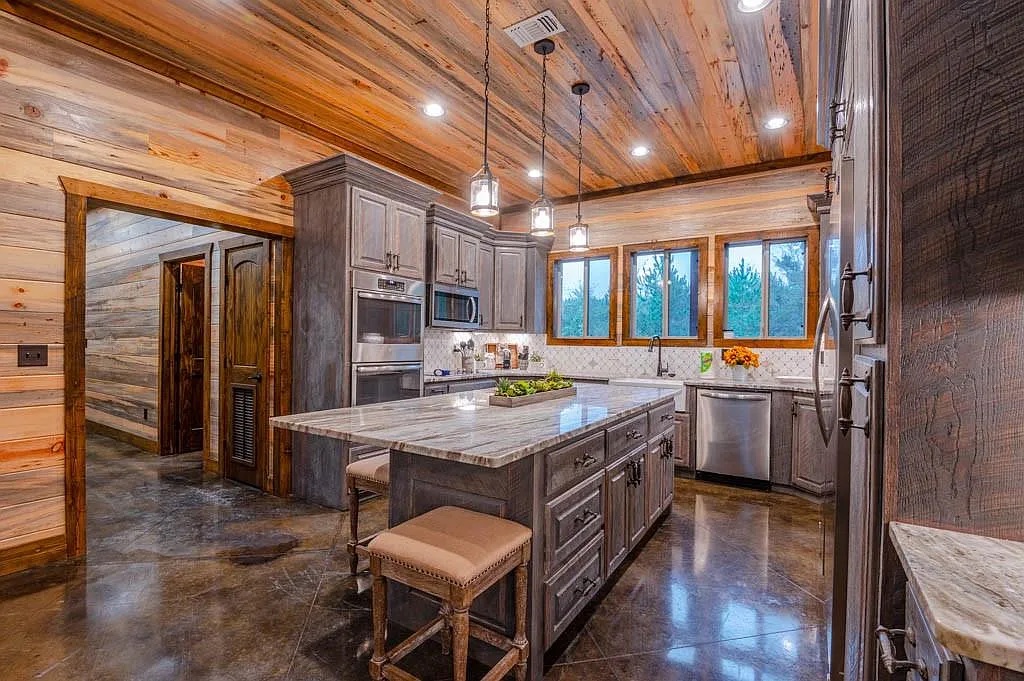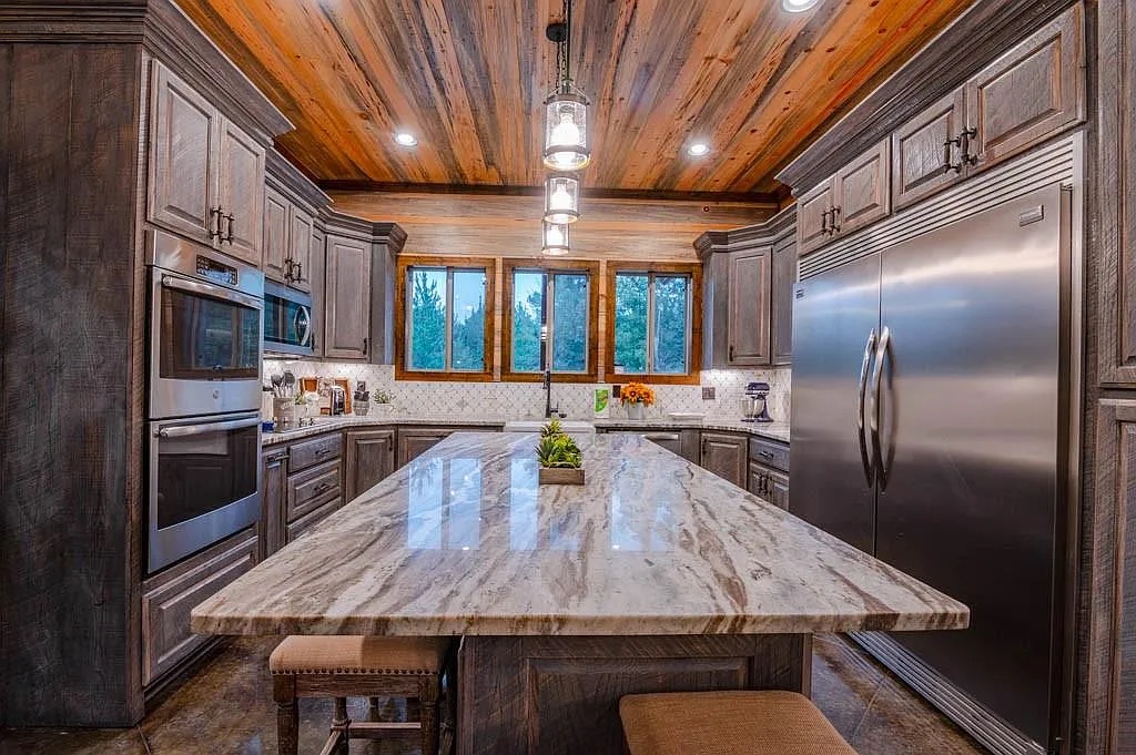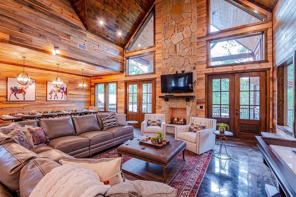 6 Bedrooms • 4 Bathrooms 4 Baths • Sleeps 1-21The main living area welcomes guests with a grand yet cozy open layout. Plush couches and a recliner surround a warm gas fireplace and a large-screen TV, the perfect spot for morning coffee or movie nights. Just off the living space, a long dining table seats twelve, while the fully stocked kitchen—complete with a double oven, industrial-style refrigerator, and ample cookware—makes preparing anything from pancake breakfasts to holiday feasts a breeze.