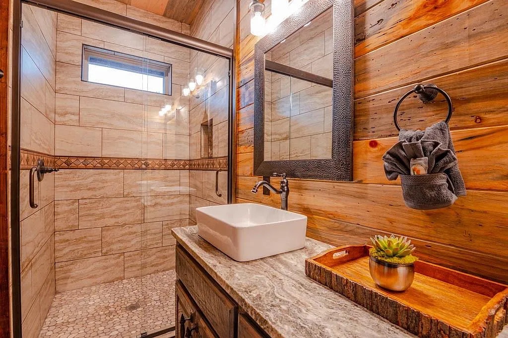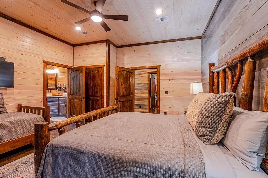 Upstairs, three additional master suites await, each with a king bed—some with twin trundles—and private baths. One suite even has a private patio for a quiet retreat. All bedrooms come with crisp linens, generous storage, and bathrooms stocked with essentials like shampoo, conditioner, and body wash so guests can pack light.