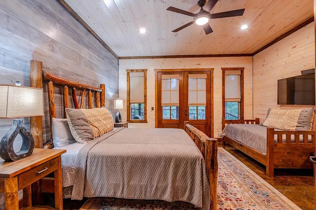 Six bedrooms are spread across two levels for privacy and space. On the main floor, the first master suite offers a king bed with a twin trundle, patio access, and an ensuite featuring a double vanity, walk-in shower, and deep soaking tub. The second master also includes a king bed and private bath. A unique bunk-and-game suite combines sleeping space with entertainment, offering a king bed, twin bunks, a twin trundle, a couch, a TV, and its own bathroom.